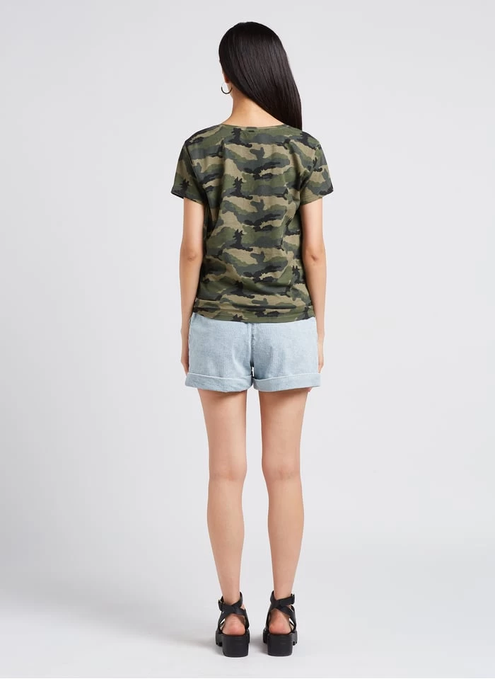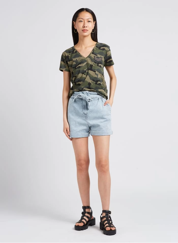 Dit model wordt aangeboden met Katoenen T-shirt met V-hals en camouflageprint by IKKS, Leren sandalen met sleehak by BA & SH