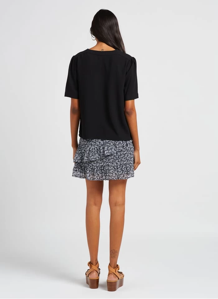 Dit model wordt aangeboden met Soepelvallende top met V-hals en korte mouw by GRACE ET MILA, Leren sandalen met sleehak by SEE BY CHLOE