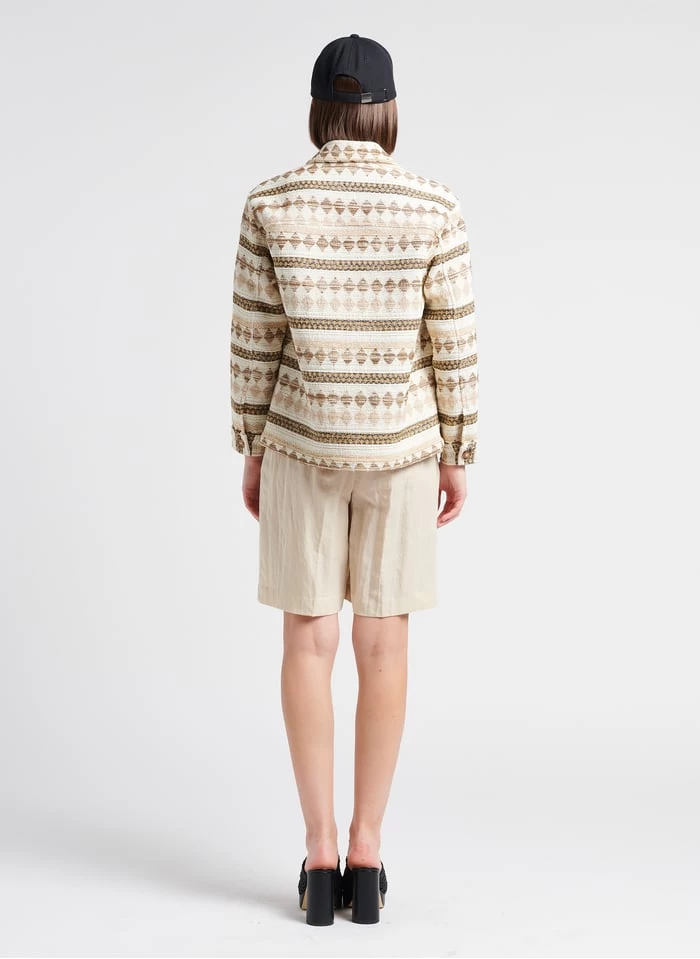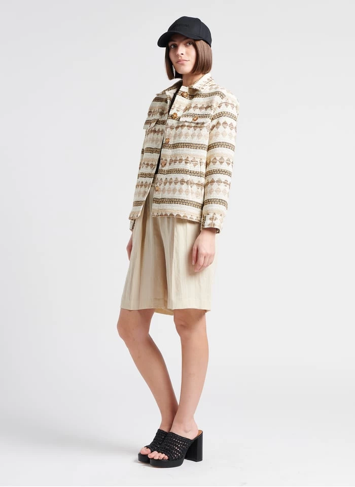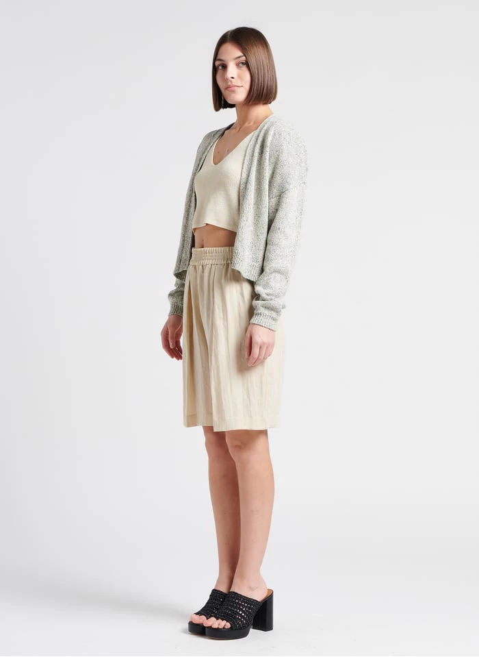Dit model wordt aangeboden met Open jacquard vest van katoen, linnen en zijde by EKYOG, Sandaaltje van raffia met hoge hak by JONAK